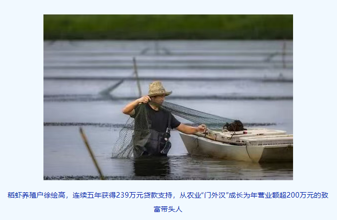 永修县稻虾养殖户徐绘高连续五年获得239万元贷款支持,从农业“门外汉”成长为年营业额超200万元的致富带头人,常年雇佣4名固定员工,旺季零工达15人,优先吸纳周边脱贫劳动力就业,入选“九江市优秀农村实用人才”。他的种养专业合作社正朝着“生态+休闲+体验”的农旅综合体迈进。