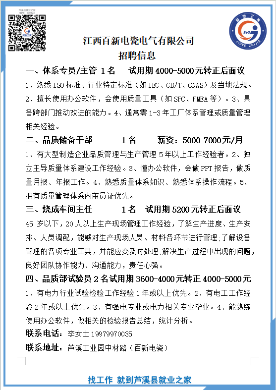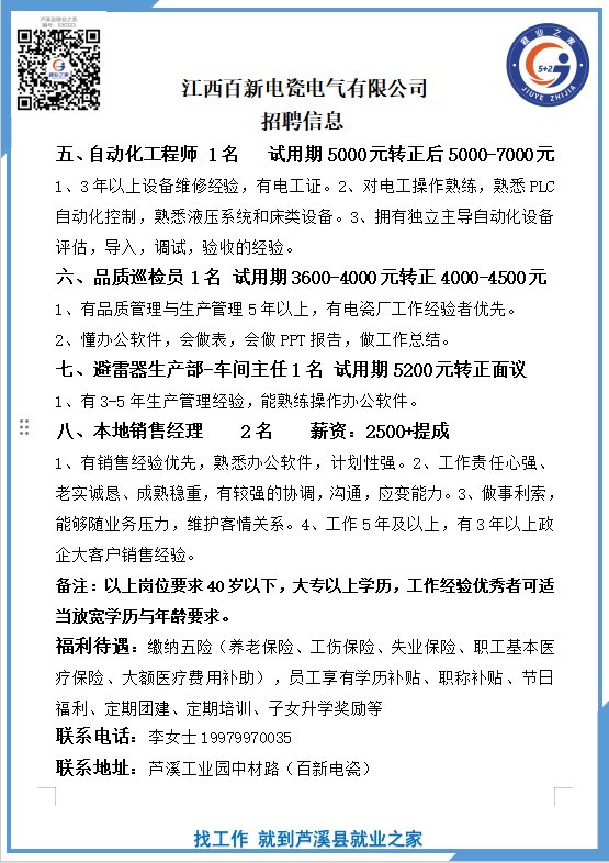 江西百新电瓷电气有限公司创建于2003年,公司于2017年投资5亿元,整体搬迁到江西电瓷产业园,占地面积150亩。公司致力于生产绝缘子、避雷器,是一家集研发、生产、销售、服务于一体的电力电网综合供应商。现因公司发展需要,诚聘以下岗位: